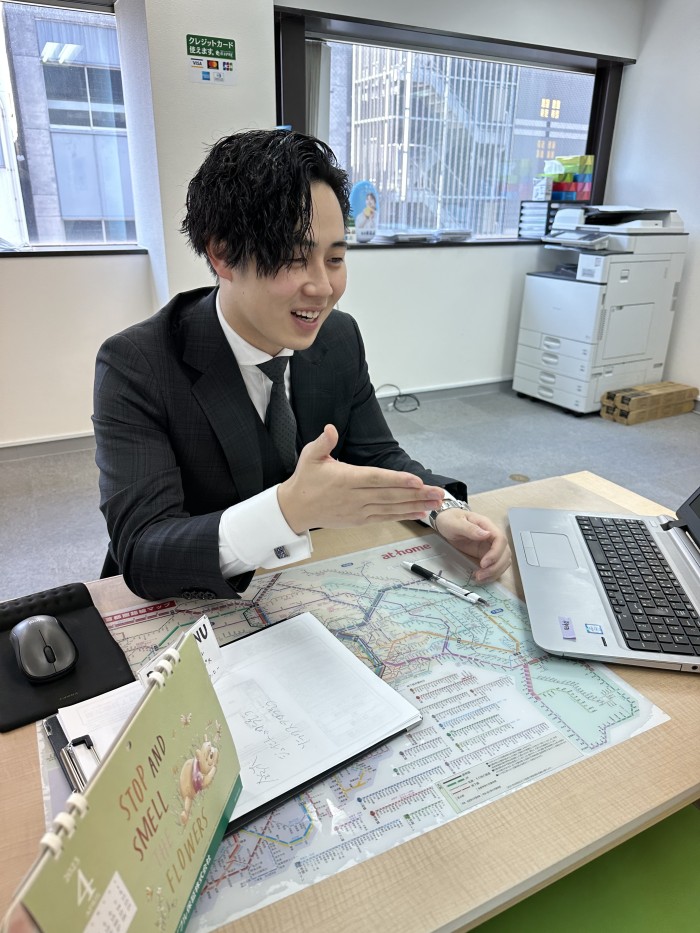 来店いただいたら、雑談などでお客様との距離を縮めます。その後、エリアや家賃、間取りなどの希望条件をヒアリング。システムを使って希望に合う物件をいくつかピックアップし、ご紹介します。